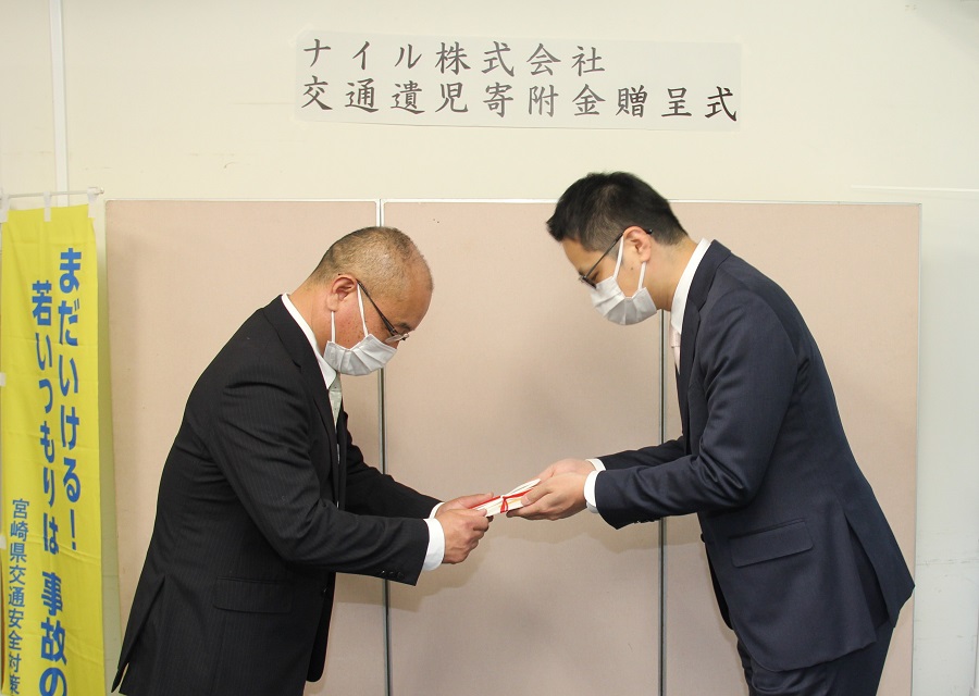交通事故を防ぎ、また交通事故で悲しむ人を減らすため、全国への寄付を進めているナイルは、日本で事故が4番目に多い地域となっている宮崎県(参照:警察庁 2021年1~6月期「都道府県別人口10万人当たり交通事故発生状況データ」)へ20万円の寄付を行いました。この寄付金は、交通事故被害者救済対策の一環として激励品の配付や入学・卒業祝金等の給付に活用していただきます。