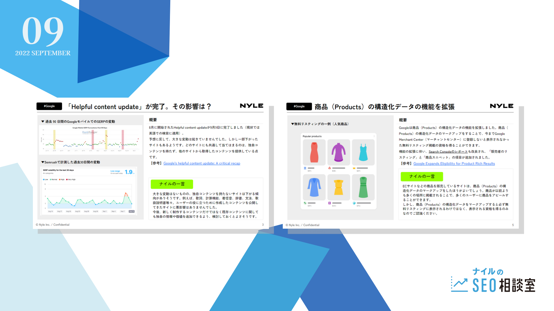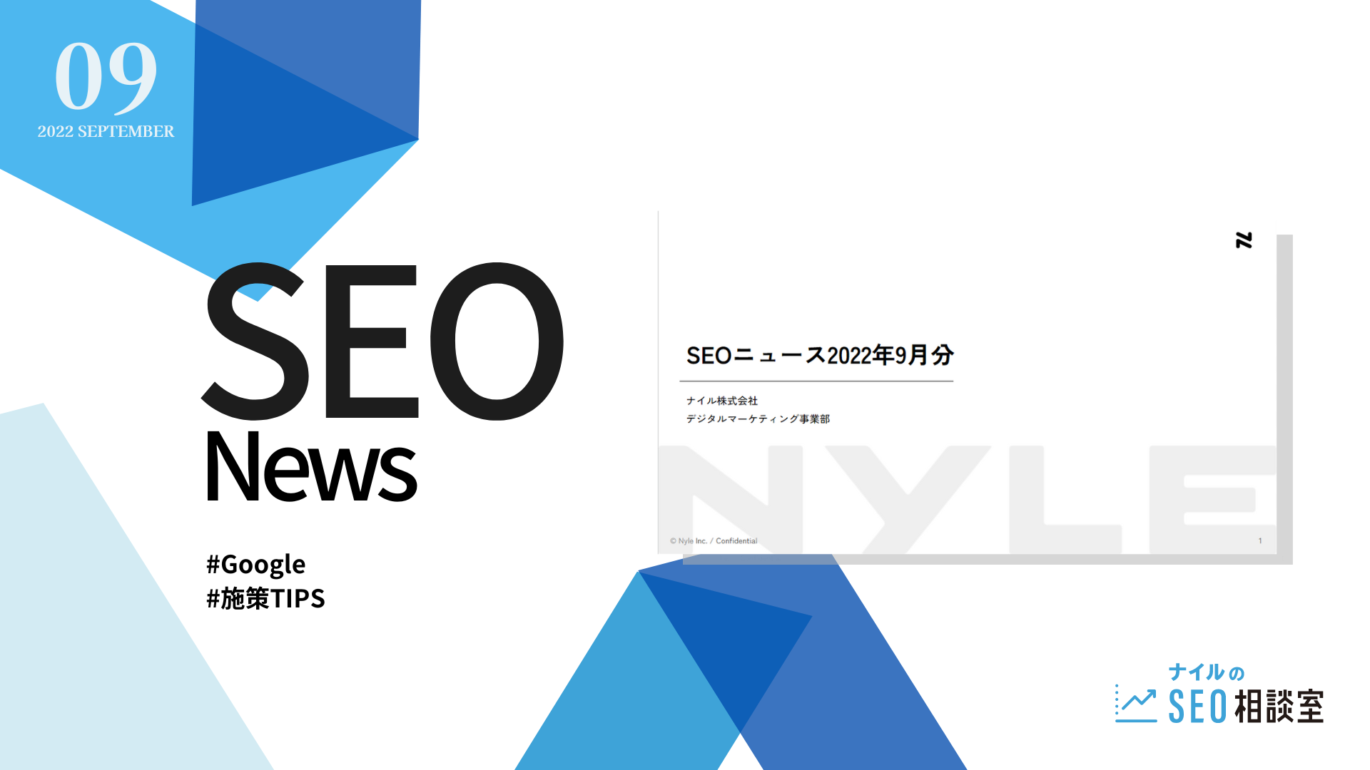 マーケティングDX事業を営むナイル株式会社(本社:東京都品川区、代表取締役:高橋 飛翔、以下、ナイル)は、Googleの最新情報、施策Tipsを毎月レポートする「SEOニュース」2022年9月度版を無料公開しました。全13ページにまとめています。