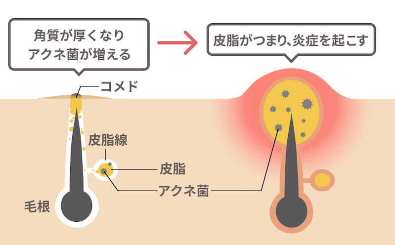 肌が乾燥すると、一定のサイクルで細胞が生まれ変わる肌のターンオーバーの乱れが生じます。そうすると正常に剥がれ落ちなかった角層が硬化したり、乱れが生じることで肌荒れになってしまい、毛穴をふさいで炎症を起こしてしまうのです。これが大人ニキビを生んでしまいます。