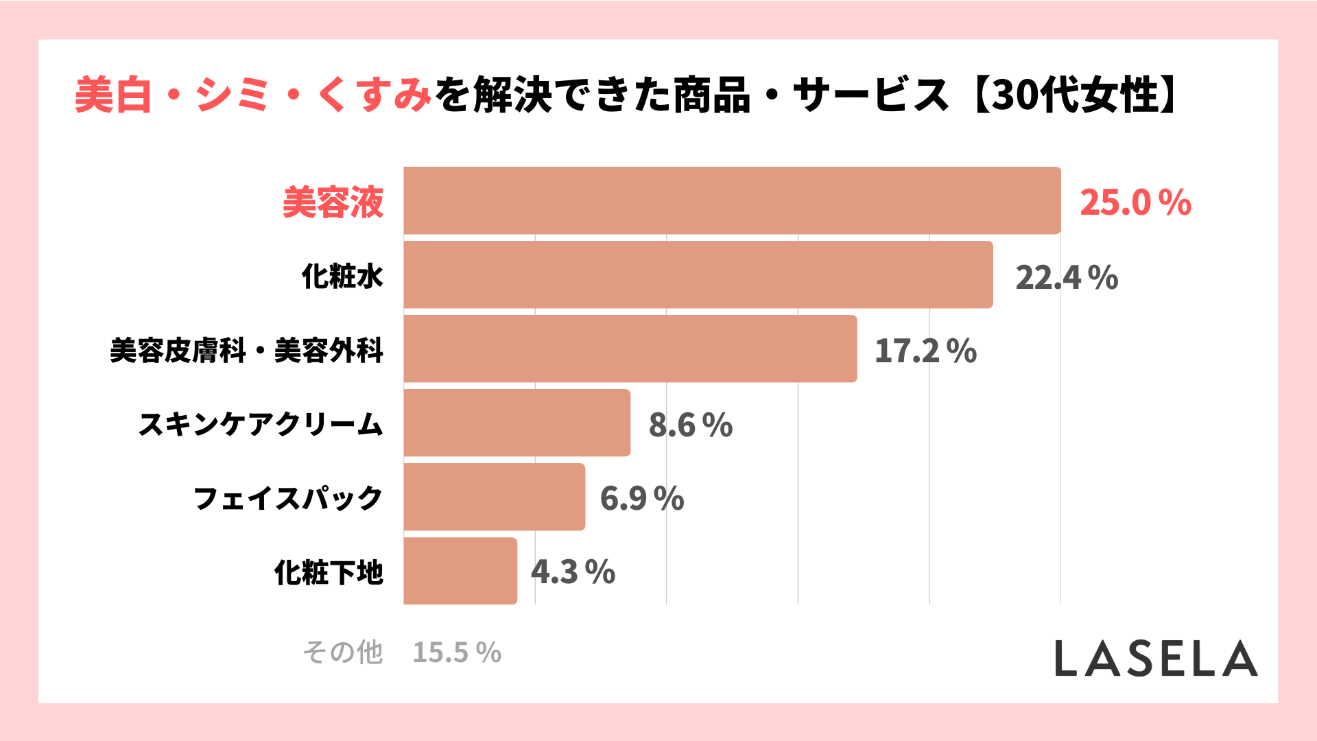 「美白・シミ・くすみ」の解決に繋がった商品・サービスを調査したところ、トップは「美容液(25.0%)」、続いて「化粧水(22.4%)」、「美容皮膚科・美容外科(17.2%)」の結果となりました。