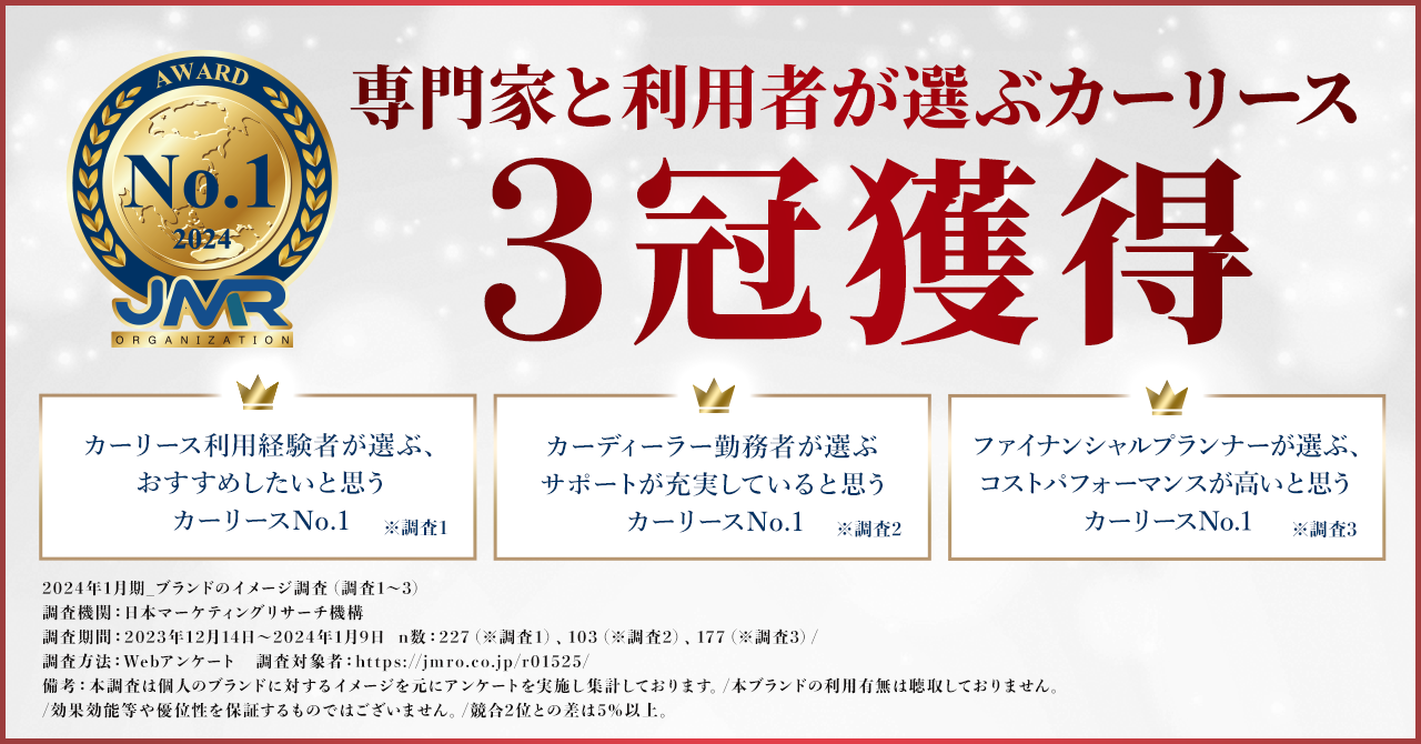 調査対象となっている20~60代のカーリース利用経験者の男女227名から「おすすめしたいと思うカーリース」として、20~50代のカーディーラー勤務者の男女103名から「サポートが充実していると思うカーリース 」として、20~50代のファイナンシャルプランナーの男女177名から「コストパフォーマンスが高いと思うカーリース」として選んでいただき、それぞれ第1位を獲得しました。