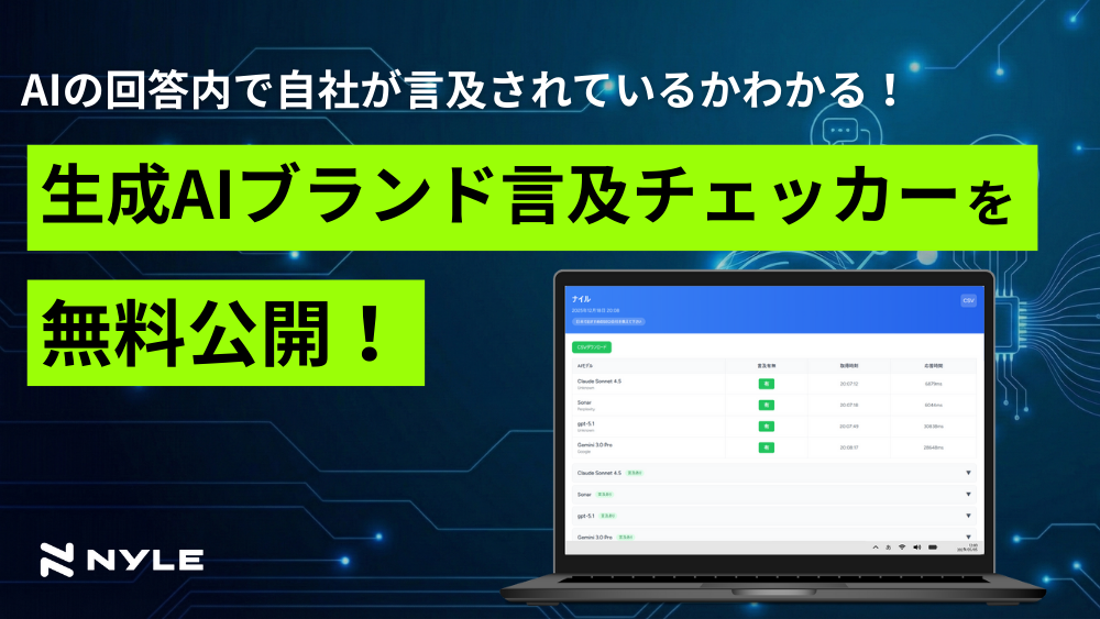 「ナイルのSEO相談室」を運営するナイル株式会社(本社:東京都品川区、代表取締役社長:高橋 飛翔、以下ナイル)は、主要な生成AIにおいて自社ブランドやサービス・商品が言及されているかを簡易的に調査できる「生成AIブランド言及チェッカー」を無料公開いたしました。
