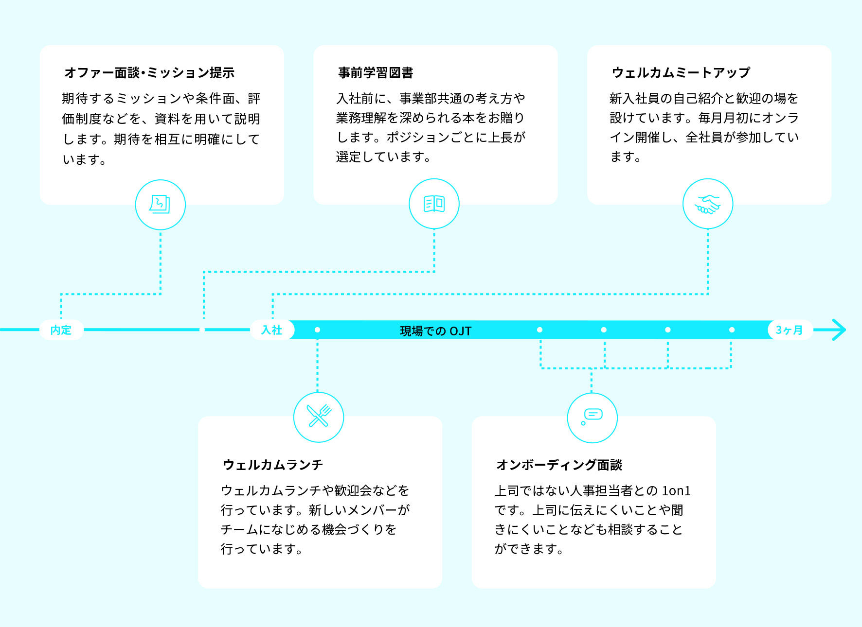 オリエンテーション後は、現場に配属されてのOJTがメインとなります。また、入社3ヶ月間で人事によるフォローアップ面談が最大5回あります。