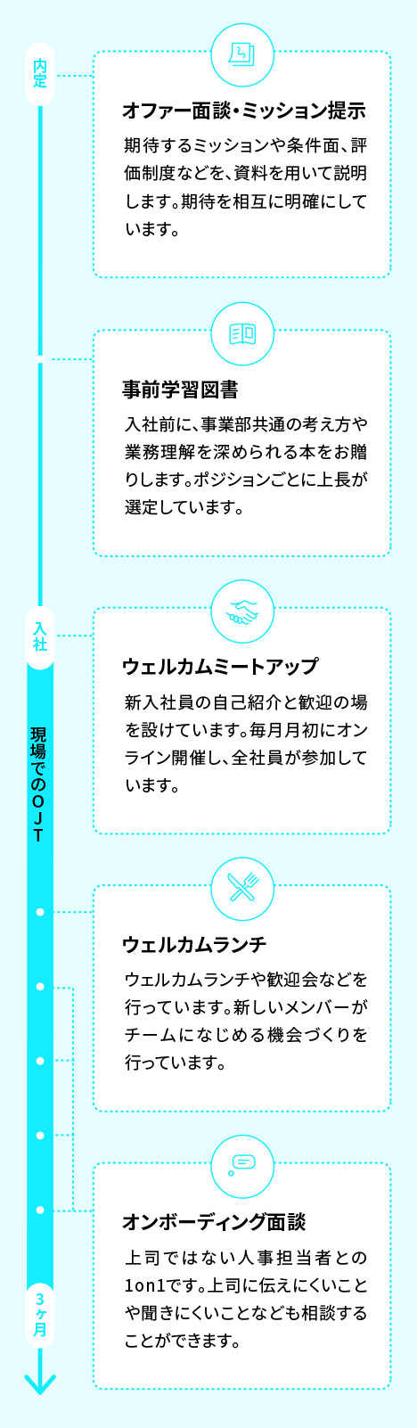 入社後のオンボーディングは、基本的にはオンラインで行います。なお、一部の部署やポジションでは、早く会社に慣れてご活躍いただくため、一定期間出社を推奨しているところもあります。